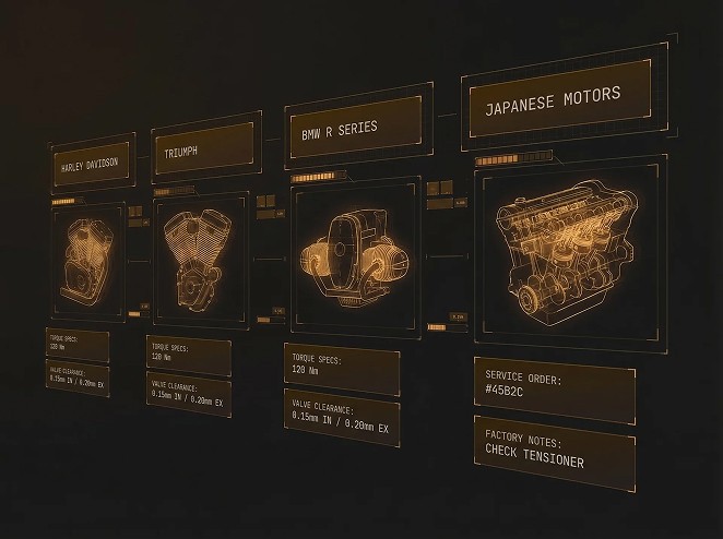 Torque specs, clearances, service sequences, and special notes pulled straight from the factory manuals. No more digging through greasy pages or hunting through PDFs.
